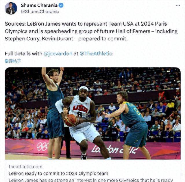 詹姆斯确认加盟美国男篮,将率领美国队出战2024年巴黎奥运会。