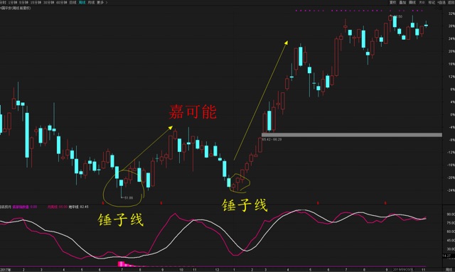 在股票K线图中,当锤头线出现在股票价格持续下跌的过程中时,很大可能就是见底信号,意味着股票价格趋势将会发生反转。锤头线的外形特征是一根实体柱很短的阳线或阴线,且通常情况下没有上影线,如果有也非常短,但是下影线很长,最少是实体柱长度的两倍以上的阳线或者阴线就叫做锤头线,而其阴线形态也可以叫做吊颈线。