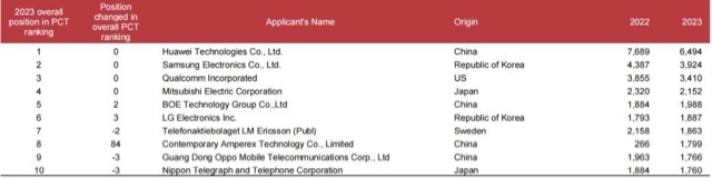 中国电信巨头华为技术有限公司的PCT申请量仍位居榜首,在2023年公布了6,494件PCT申请。大韩民国的三星电子位居第二(3,924件申请),紧随其后的是美国的高通公司(3,410件)、日本的三菱电机(2,152件)和中国的京东方科技(1,988件)。在前十位申请人中,中国的宁德时代增长最快,2023年公布的申请量增加了1,533件,排名上升了84位至第八位。相比之下,排名第一的华为技术有限公司在2023年公布的申请量同前一年相比减少了1,195件。