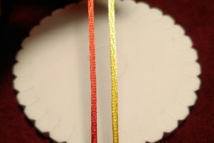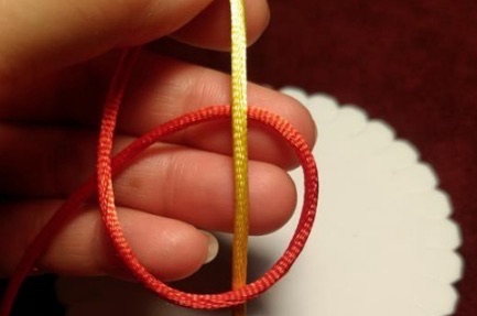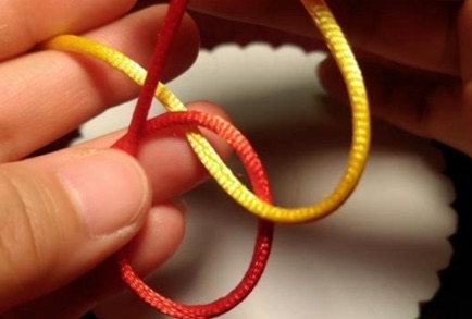 3、黄线从背面由左至右绕过来,压住红线,再穿进红线圈里。