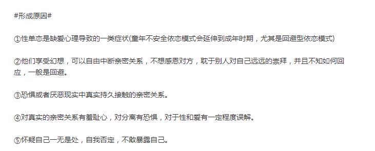 但是,性单恋者又渴望被爱,他们幻想着爱的美好,所以他们还是渴望爱情,幻想着跟自己喜欢的人谈恋爱的样子,在一起的样子,只不过一旦这个人接受了你,性单恋者就会变得厌恶对方,其实本质还是自己厌恶自己导致的。