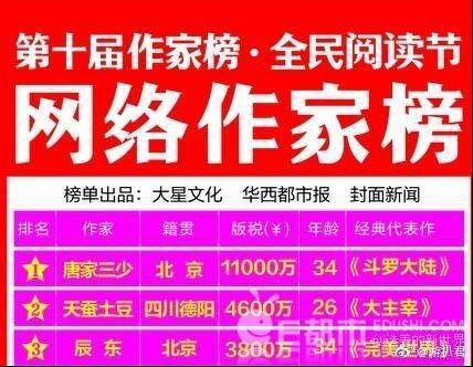 头破苍穹 小说 网络小说作者会有多方面的收入,首先是网站的销售收入,跟网站签约之后,会跟网站进行分成,《斗破苍穹》这本书写了五百多万字,写了三年多,应该能拿到1000万的分红。第二部分是游戏改变的收入,这个方面会有四百万的收入。第三部分是漫画,这部分收入会有三百万的收入,第四就是无线了,这方面比较多,因为《斗破苍穹》本就是一个人气非常高的书,无线这方面,拿到八百万是很正常的,这样算起来,一部小说就拿到了两千多万的收入了。 天蚕土豆上天天向上是哪一期天蚕土豆是上的2013年3月22日的那期《天天向上》,在节目中他自爆当时已经收到小说收入为1800万。