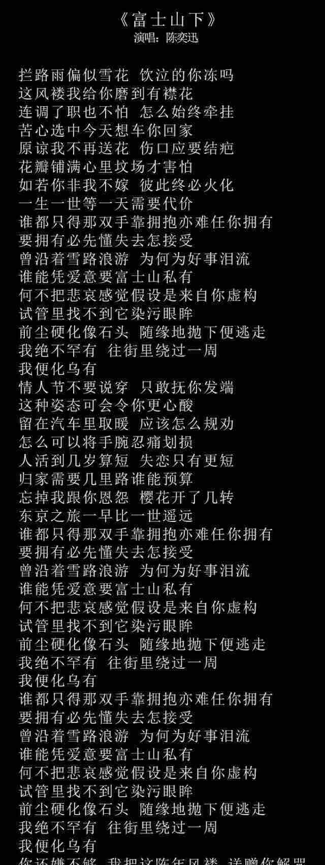 《富士山下》歌词 《爱情转移》歌词《富士山下》收录在专辑《认了吧》中,由环球唱片在2006年11月23日发行。《爱情转移》收录在《What’S Going On...?》中,于2007年4月24日发行。
