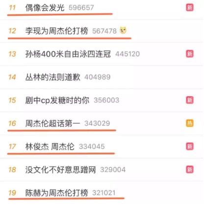 因为周杰伦的粉丝都是80后和90后,所以一开始对打榜是不清楚的,后来双方粉丝进行了大规模的battle,后来,很多明星也加入了为周杰伦打榜做数据的行列中,像林俊杰、李现、陈赫、张歆艺等。