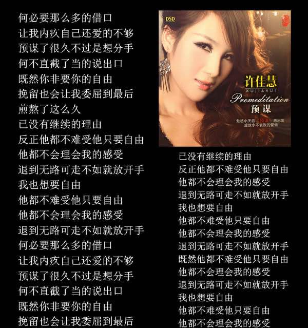 《预谋》歌词徐佳慧以高亢和略带沙哑的声音演唱了该歌曲。歌词中:“反正他都不难受他只要自由,他都不会理会我的感受。退到无路可走不如就放开手,我也想要自由”,唱出了对失恋的无奈和渴望获得爱情的重生。【周边网】